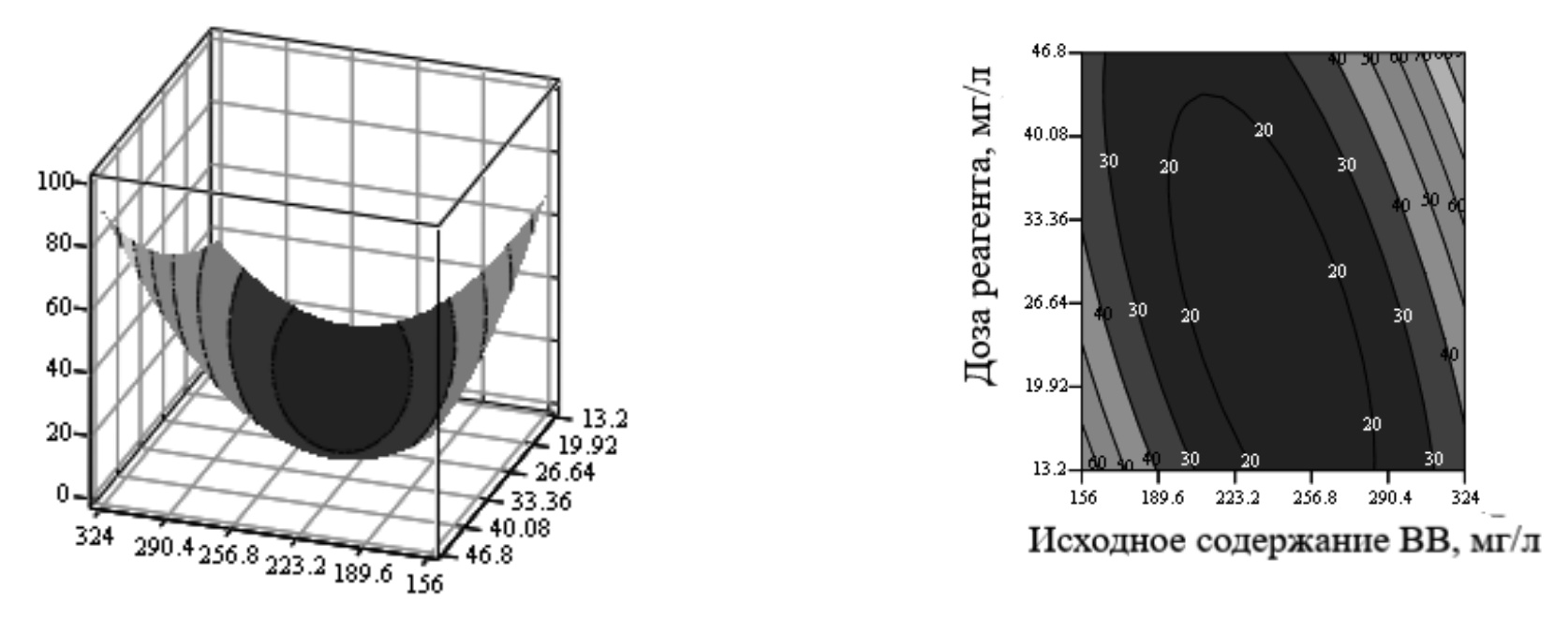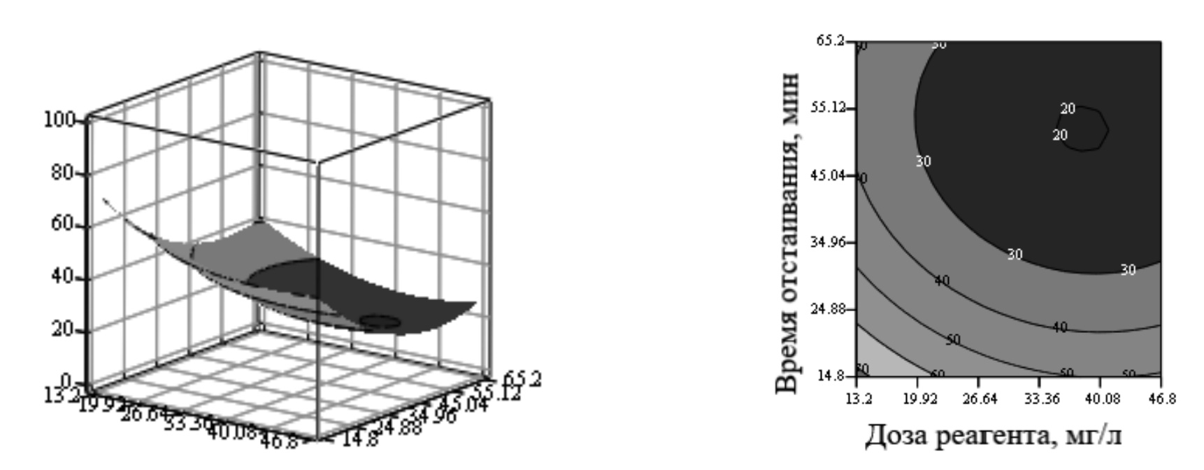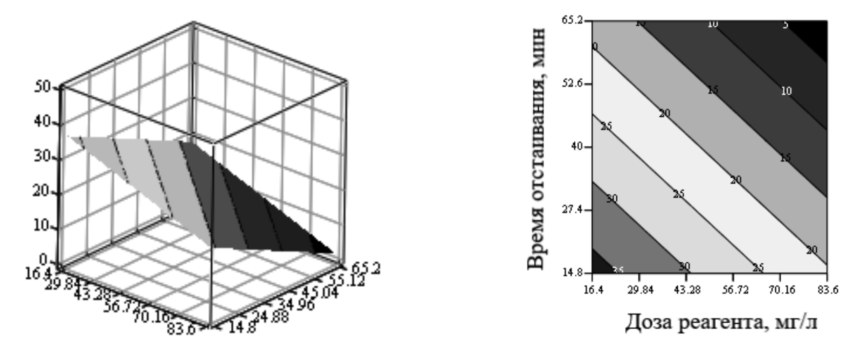Полученное уравнение регрессии позволяет при фиксации одного из параметров, например исходного содержания взвешенных веществ, получить трехмерный график с тремя переменными, в котором варьируется на исследуемом диапазоне доза реагента и время отстаивания, а откликом является остаточное содержание взвешенных веществ. Затем, выявив наилучшие показатели, можно, зафиксировав другой показатель, например время отстаивания, получить изменения по входящему содержанию взвешенных веществ и по дозе реагента.