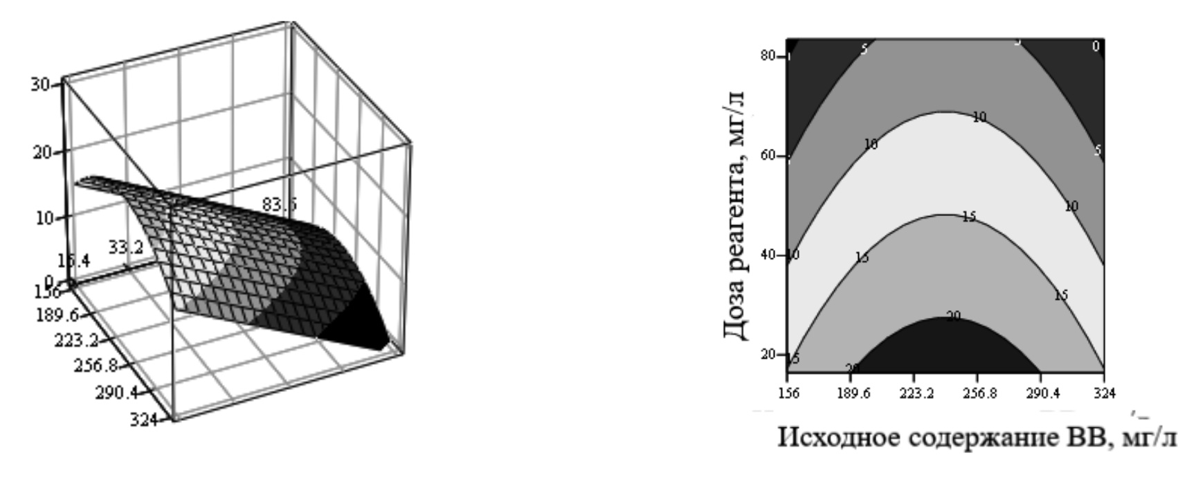 - Представлены результаты трехфакторного ротатабельного, центрально-композиционного планирования эксперимента с обработкой экспериментальных данных и полученными уравнениями регрессии второго порядка, связывающего такие входящие данные, как: исходная концентрация взвешенных веществ, доза реагента, время отстаивания при применении различных реагентов, что позволило при фиксации одного параметра получать поверхности отклика в зависимости от искомых факторов.