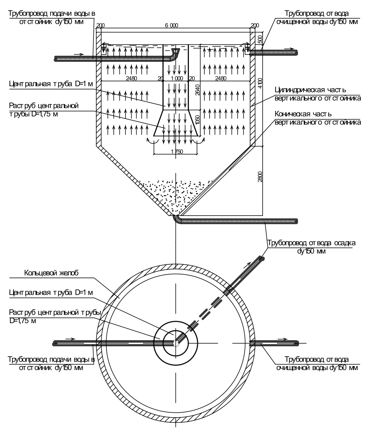 По результатам расчета на рис. 11 представлена конструкция вертикального отстойника с нисходяще-восходящим движением воды.