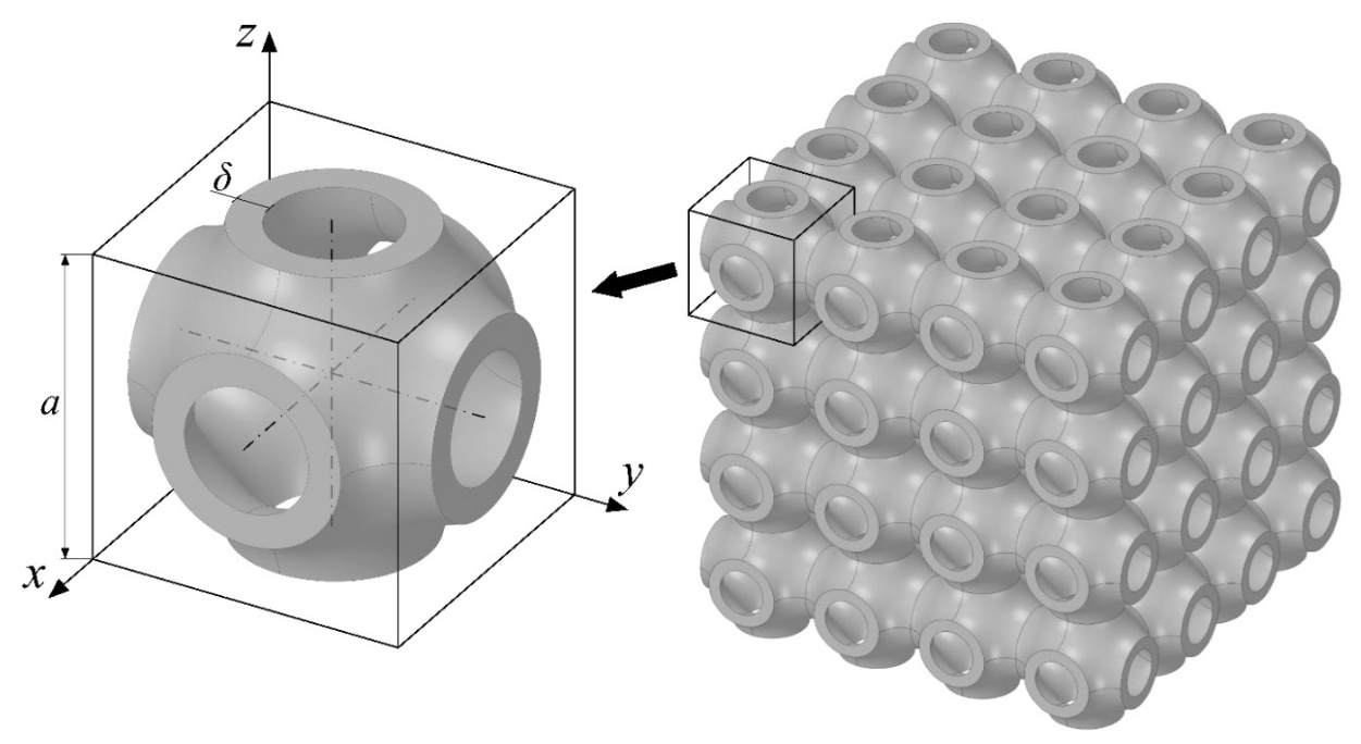 На рис. 1 изображен элементарный элемент (элементарная ячейка) исследуемой трижды периодической минимальной поверхности Шварца Р, а также решетка, образующаяся в результате копирования (трансляции) ячейки в трех ортогональных направлениях декартовой системы координат.