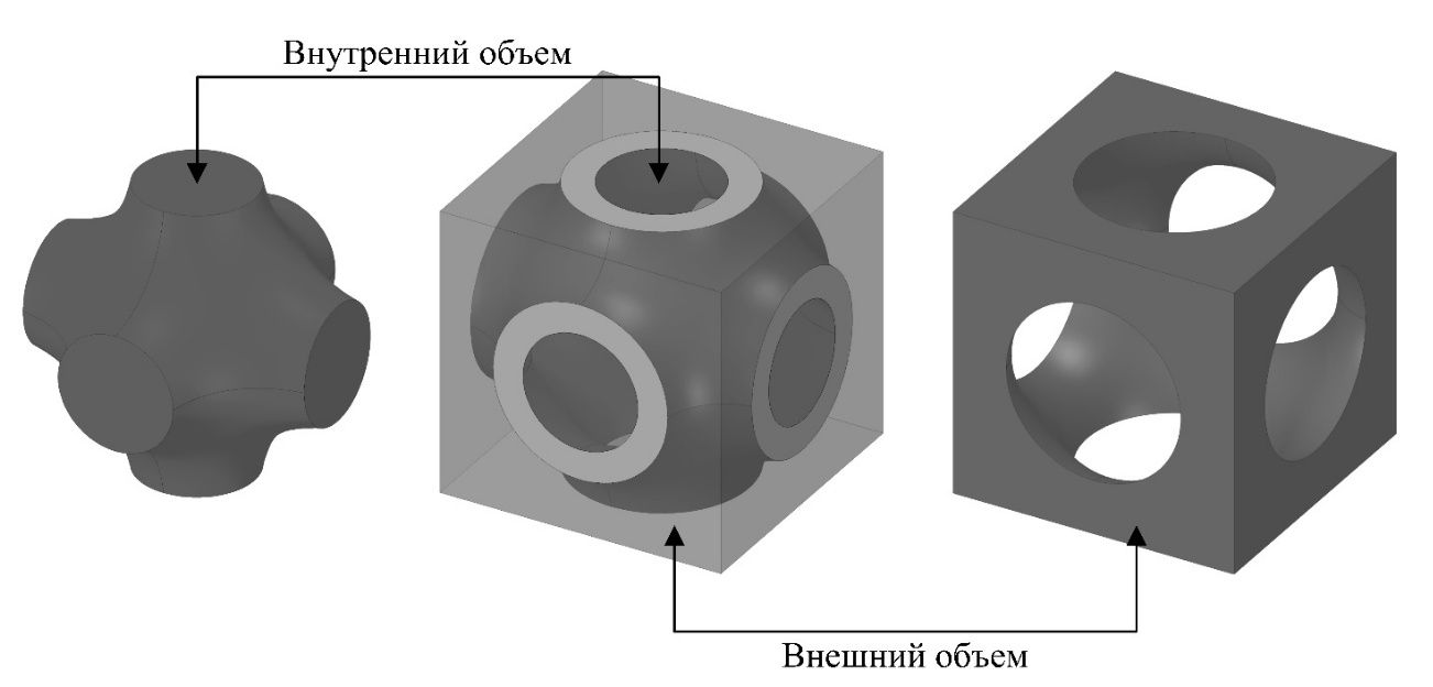 Как было сказано ранее, большинство TPMS делят пространство на два или более непересекающихся объема. На рис. 2 представлены внешний и внутренний объемы, на которые делит пространство элементарная ячейка TPMS Шварца Р.