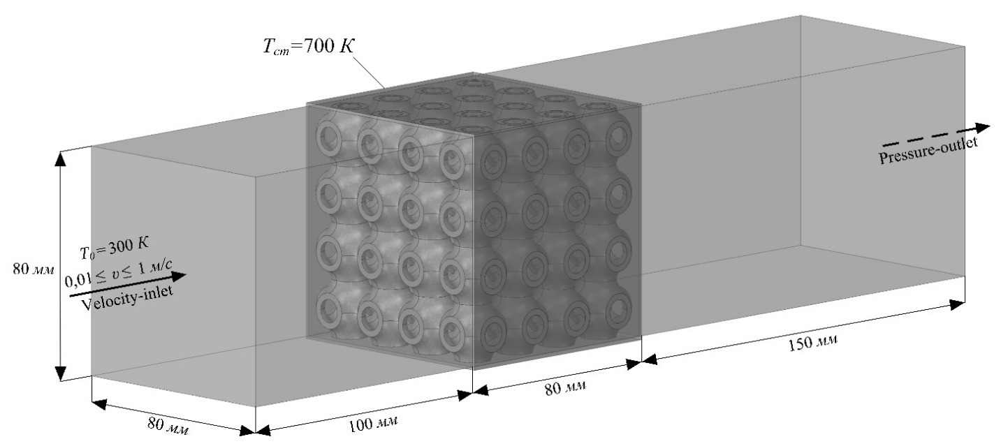 Однако получить аналитическое решение системы уравнений (1) – (3) с учётом сложной геометрии ячейки Шварца Р крайне сложно. Поэтому для решения задачи используется численный метод конечных элементов, реализованный в программном комплексе ANSYS Fluent. Геометрическая модель и краевые условия для численного решения задачи тепломассопереноса в пористой TPMS-среде изображены на рис. 3.