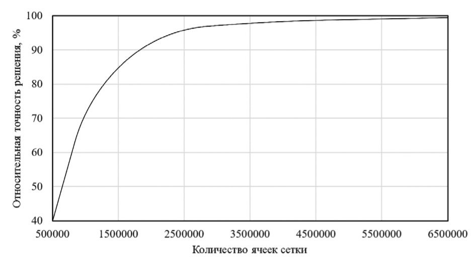 В ходе построения сетки был проведен анализ сеточной сходимости (рис. 5) и определено, что оптимальным является решение на сетке, состоящей из 4 – 4,5 млн. ячеек, поскольку дальнейшее увеличение количества элементов значительного влияния на точность решения не оказывает, но сильно увеличивает длительность и сложность решения.