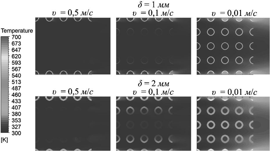 Полученные контуры скорости (рис. 6) и температуры (рис. 7) демонстрируют распределение этих параметров по всему каналу. Анализ профилей скорости показывает, что зоны турбулентного течения возникают в областях, непосредственно прилегающих к TPMS-каркасу, что способствует интенсификации теплообмена.