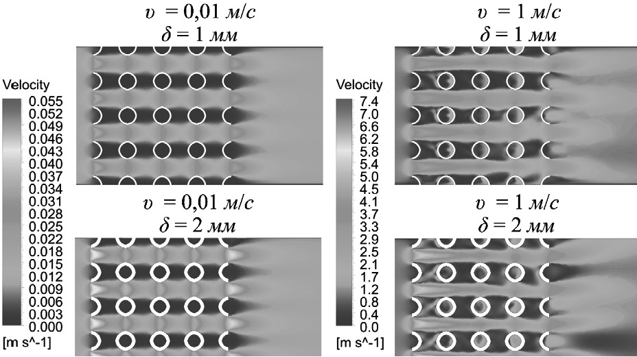 Полученные графики иллюстрируют, что потери давления увеличиваются с увеличением начальной скорости потока по степенному закону. Рост потерь давления в потоке жидкости обусловлен увеличением трения между жидкостью и стенками канала, а также увеличением внутреннего трения в жидкости. Каркас на основе трижды периодической минимальной поверхности Шварца P внутри канала приводит к возникновению сложных турбулентных течений, которые приводят к дополнительным потерям давления.