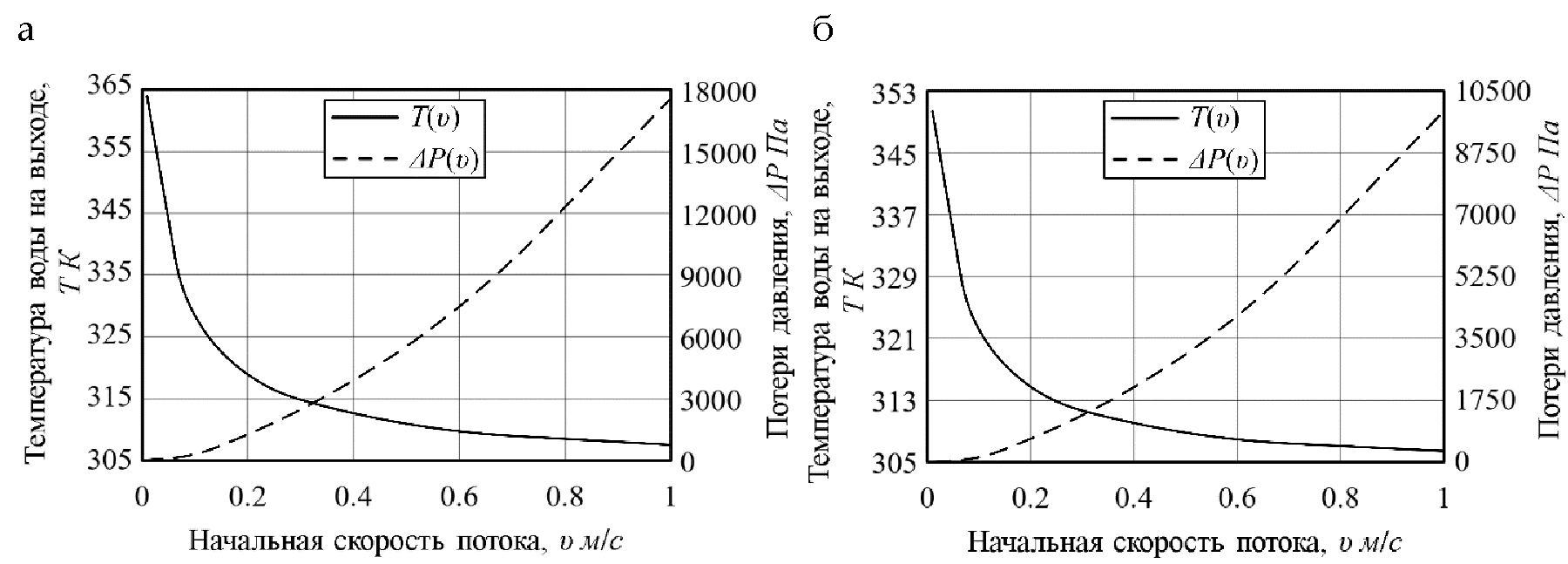 На основе численного эксперимента получены зависимости потерь давления в канале и температуры воды на выходе из канала от начальной скорости потока (рис. 8).