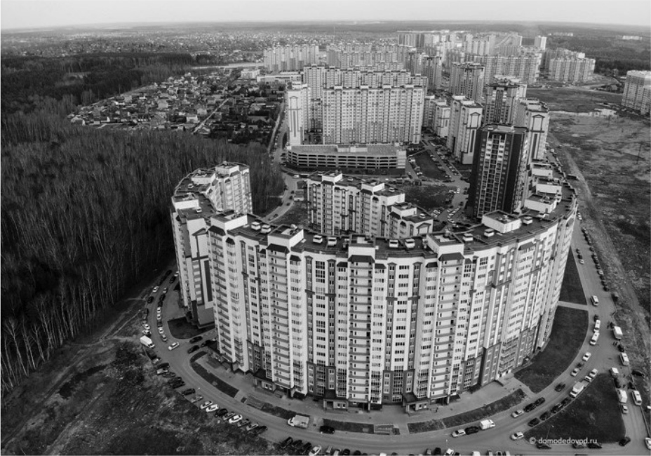 Необходимо отметить, что жилая застройка в российских городах в последние годы формируется в основном на их окраинах и состоит из многоэтажных однотипных многосекционных зданий (рис. 1). Как правило, в ней отсутствует необходимая компактность, зачастую появляются ничем не занятые пустыри, нет четкой позиции при решении подземных и надземных пространств, в частности по крытым автомобильным стоянкам, инженерным сетям.