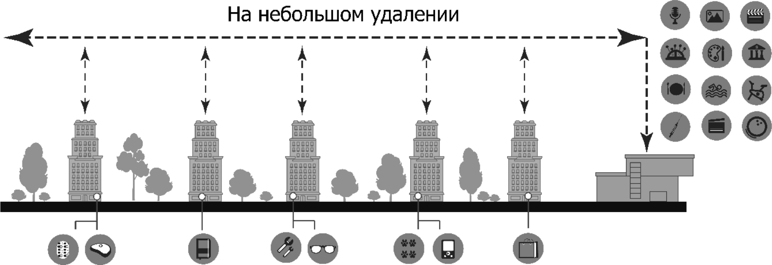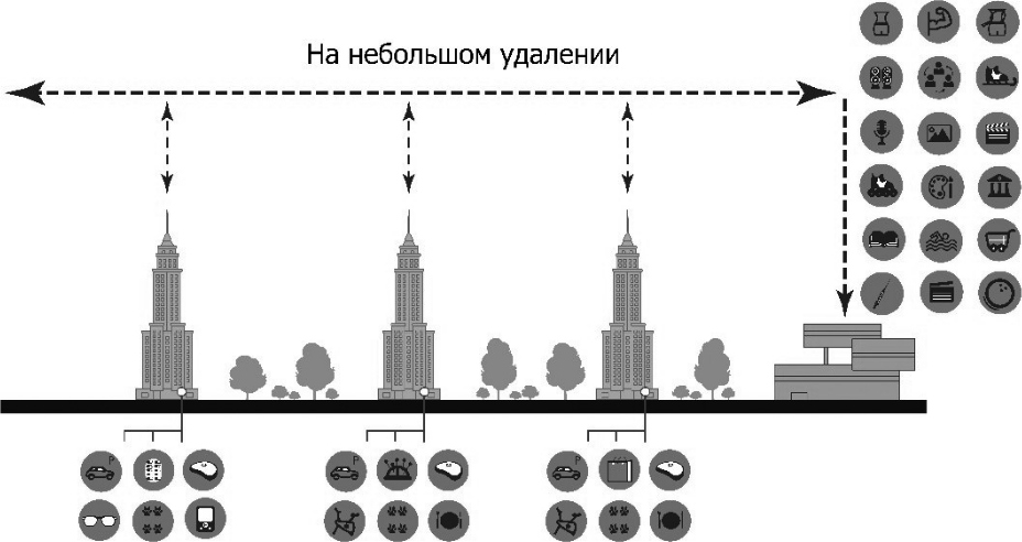 В средне- и многоэтажной застройке наблюдается небольшое «вкрапление» обслуживающих элементов в структуру самих жилых домов, но основной состав элементов социальной инфраструктуры находится в «центре» микрорайона или жилого района (рис. 6).