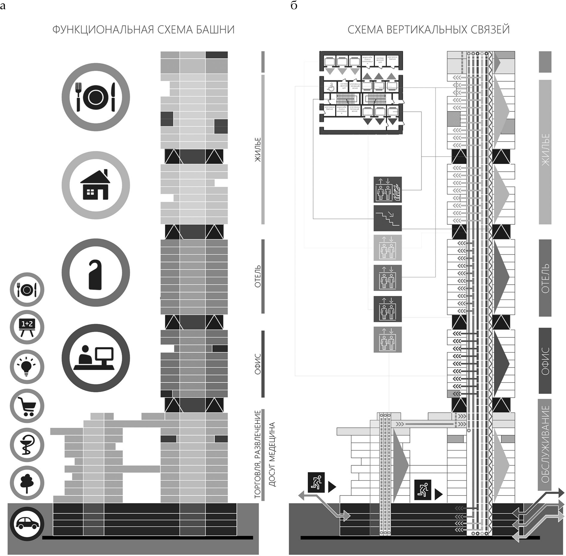 Особый интерес вызывают многофункциональные высотные здания и комплексы со стилобатом, представляющие уникальные объемно-планировочные элементы для создания удобной, комфортной жилой среды. В структуре современных городов получает развитие концепция вертикального урбанизма, когда высотное здание является продолжением городской застройки с включением всех необходимых для комфортной жизни элементов. Это происходит за счет возможности сконцентрировать и удобно разместить в них жилье, офисы, отели во взаимосвязи с различными обслуживающими функциями. При проектировании таких типов зданий возникает достаточно сложная задача организовать удобные связи между различными функциональными элементами, позволяющими, с одной стороны, создать определенную изоляцию между жильцами, офисными работниками, временно проживающими в отеле, с другой – дать возможность всем пользоваться социальной инфраструктурой, которая размещена в структуре здания или комплекса.