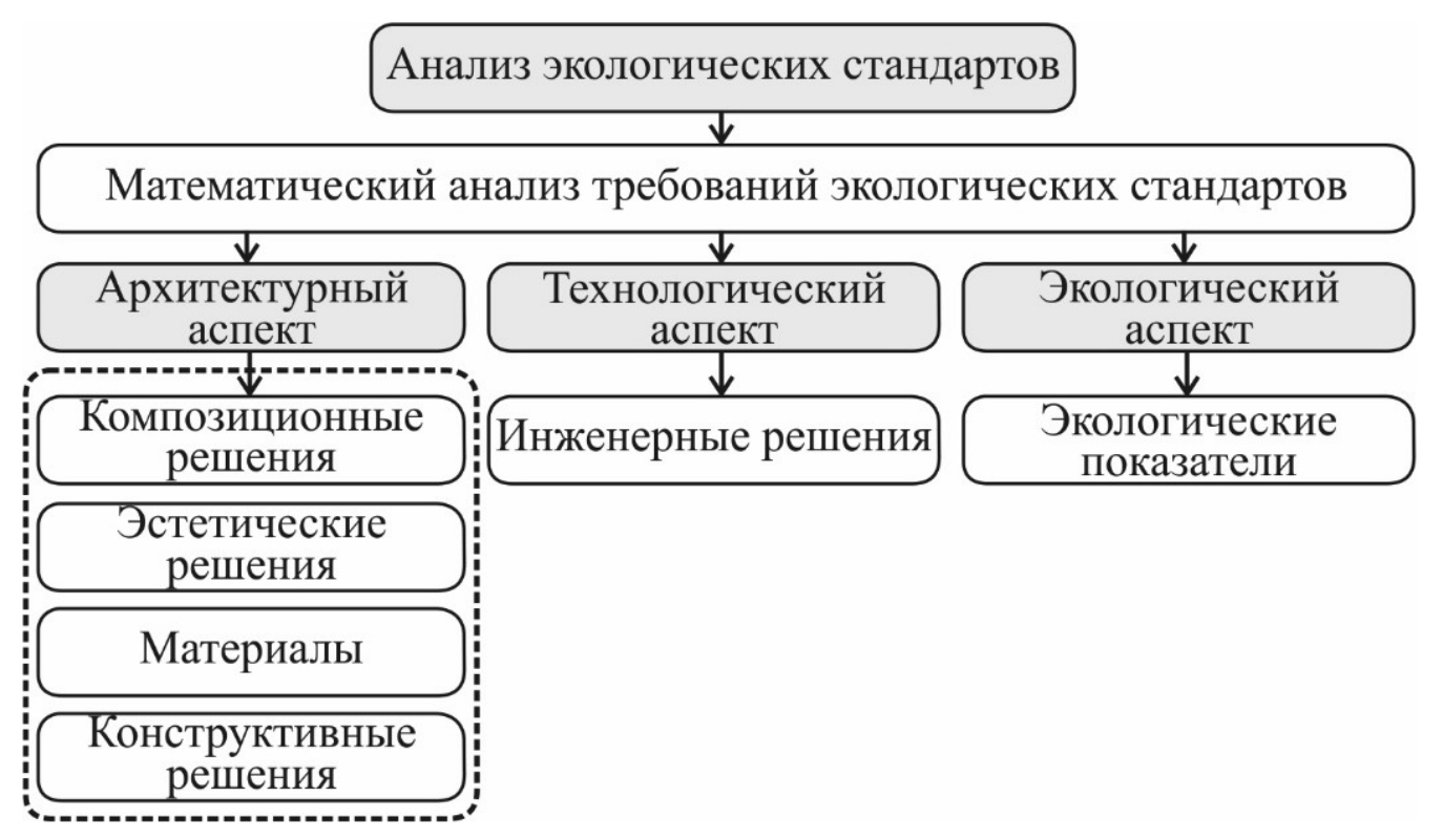 Методология исследования используется комплексная с математическим и сравнительным методами анализа. Подсчитываются все требования, используемые при экооценке объекта. Выделяются критерии, касающехся архитектурного, технологического и экологического аспектов (рис. 2). Далее производится сопоставление показателей и сравнительный анализ результатов.