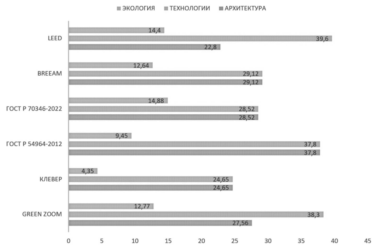 2. При сравнении выявленных значений между собой определено, что международные и российские системы практически в равных долях уделяют внимание архитектурным и технологическим аспектам при сертификации. Наименьшее количество критериев по экологии и охране окружающей среды.