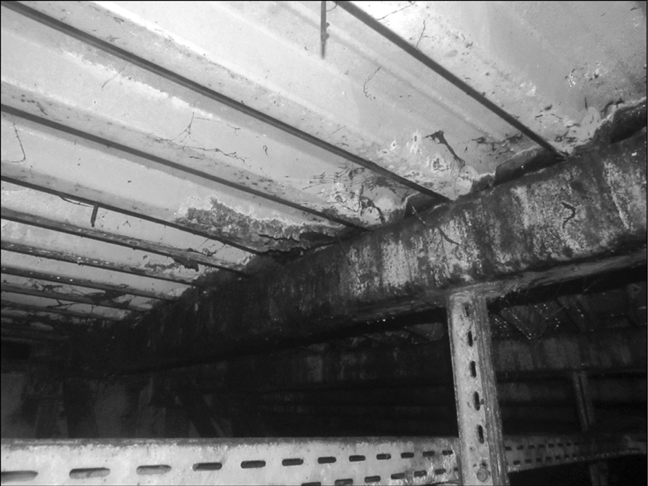 Рис. 6. Следы процесса выщелачивания с разрушением защитного слоя и оголением поперечного армирования по нижней грани балок плиты покрытия на втором этаже в зоне сопряжения блоков здания (температурный деформационный шов)