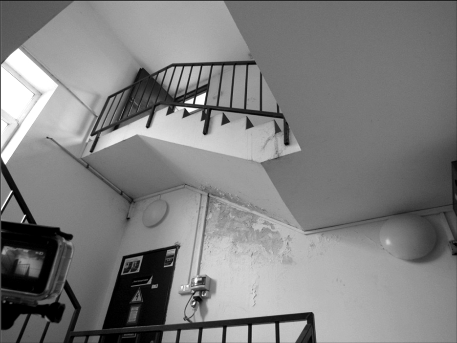 Рис. 5. Сухие следы увлажнения поверхностей стен помещения встроенной лестницы вследствие нарушения его температурно-влажностного режима в холодный период года