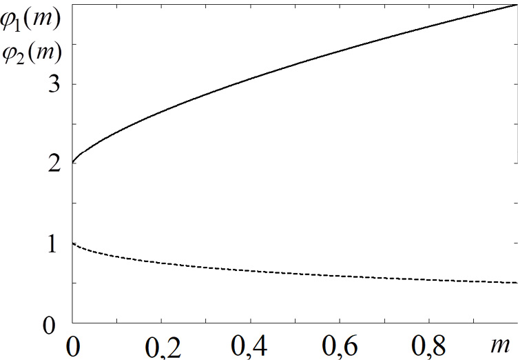 Рис. 1. Графики зависимости функций φ₁(m) (сплошная кривая) и φ₂(m) (штриховая кривая) от пористости среды m