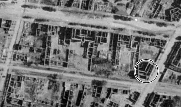 Рис. 7. Фрагмент немецкой аэрофотосъемки от 16.05.1943 г. Кругом отмечено исследуемое здание Училищного дома