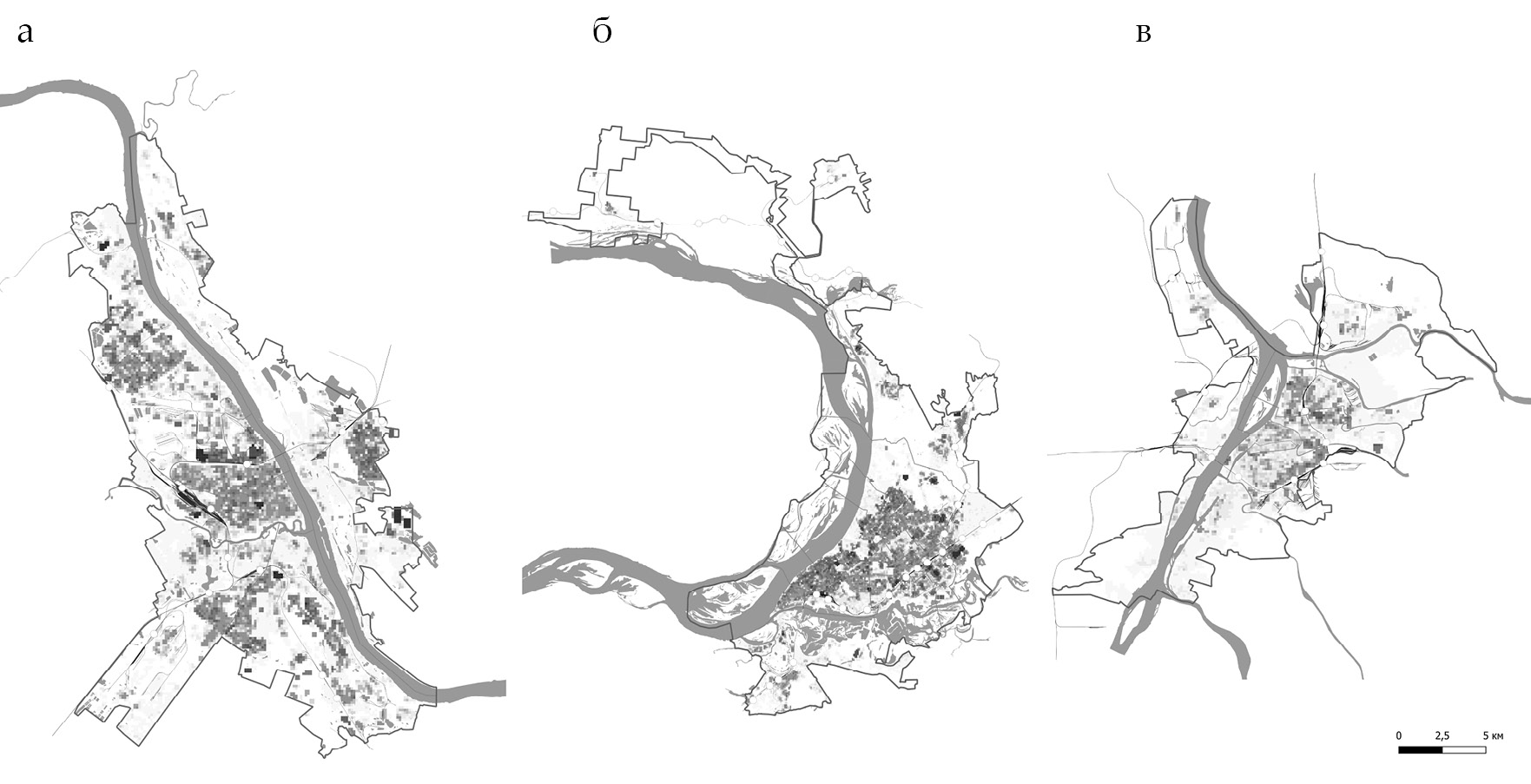 Анализ полученной графической информации показывает, что во всех исследованных городах отмечается «мозаичное» распределение коэффициента плотности застройки, однако за исключением некоторых городов, таких как Казань, прослеживается тенденция его увеличения с приближением к центральному железнодорожному вокзалу. Коэффициент плотности застройки изменялся от 0,2 и ниже (светло-серый) до значений, превышающих 3,0 (тёмно-серый), как представлено на рис. 1. Распределение плотности застройки формировалось в процессе градостроительного развития, а также связано с периодом индустриального строительства многоквартирных жилых домов и новейшим периодом девелопмента [8].
