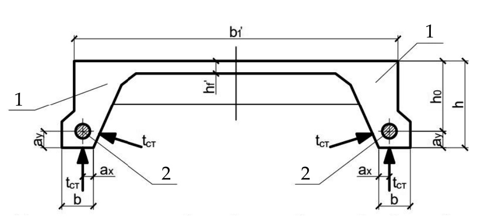 Рис. 1. Поперечное сечение сборной железобетонной ребристой панели перекрытия до реконструкции: 1 – продольное ребро панели; 2 – основная продольная арматура; b – ширина продольного ребра, мм; bʹ1 – ширина полки панели, мм; hʹf – толщина полки панели, мм; h – высота продольного ребра, мм; h0 – рабочая высота сечения, мм; ax и ay – глубина залегания продольной арматуры по осям координат, мм; tст – температура среды стандартного пожара, °С