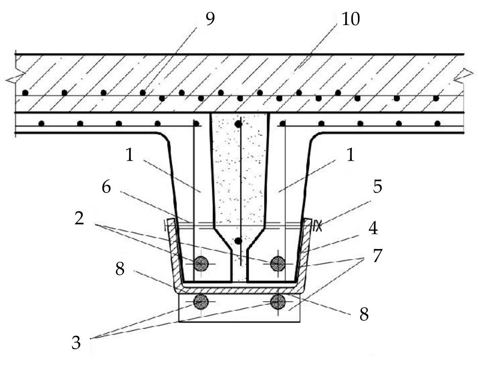 Рис. 2. Поперечное сечение сочлененных железобетонных ребристых панелей перекрытия, усиленного горизонтальными затяжками снизу и монолитной плитой сверху: 1 – продольное ребро панели; 2 – основная продольная арматура; 3 – дополнительная арматура – тяжи затяжки; 4 – анкер из полосовой стали; 5 – стяжной болт, оборудованный шайбой и высокой гайкой; 6 – сквозное отверстие в ребрах сопряженных панелей; 7 – цементный раствор; 8 – сварные швы; 9 – дополнительная арматурная сетка полки плиты; 10 – дополнительная монолитная плита из легкого бетона