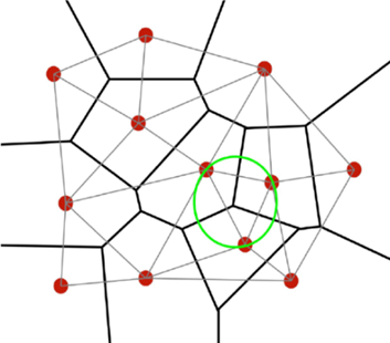 На рисунке показано множество случайно расположенных точек, по отношению друг к другу на разных расстояниях и под случайными углами. Это образ исходного хаоса. Далее Вороной ставит задачу надстроить над этими случайными точками упорядоченную структуру. Для этого, во-первых, для каждой точки выбирается соседняя точка, расположенная к ней ближе других. Обе точки соединяются отрезком прямой. Таким образом, прямыми соединяются все пары точек, расположенные друг от друга на кратчайших расстояниях. На рисунке это светло-серые линии. Во-вторых, к середине этого отрезка восстанавливается перпендикуляр. В-третьих, для каждой пары точек проделываются указанные процедуры. В-четвертых, продолжения перпендикуляров соседних пар точек пересекаются, и точки их пересечения образуют узлы новой решетки (диаграммы Вороного). В итоге все перпендикуляры (на рисунке это жирные линии) образуют сеть ячеек уже упорядоченной (построенной по правилам) конфигурации. Этот принцип разбиения, или паттерн Вороного, применяют не только математики, но и архитекторы.