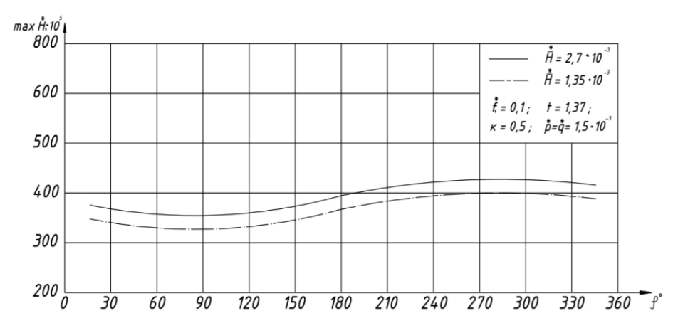 Fig. 4. Graph of the dependence of the value of the maximum marginal normal voltage in the ring on the value of the time load sector