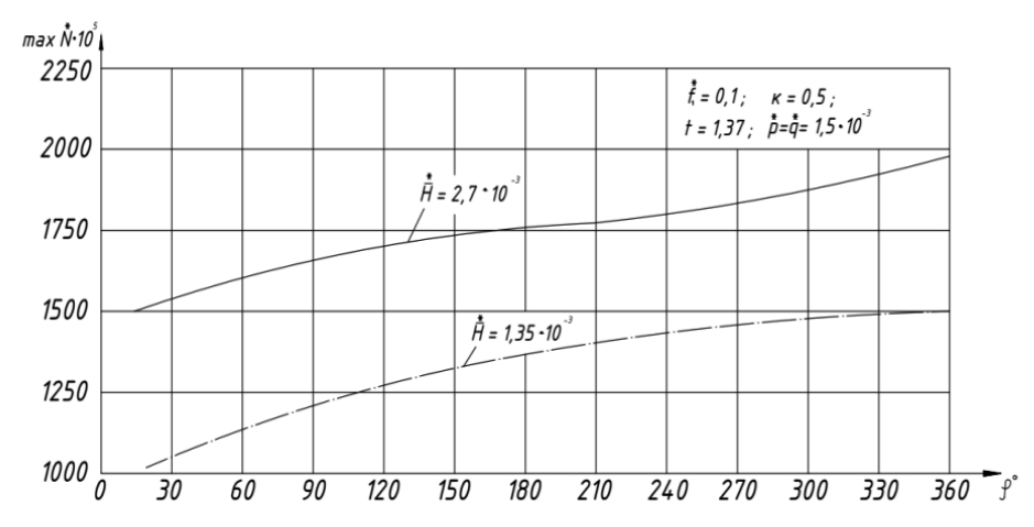 Fig. 9. Graph of the dependence of the maximum value of the normal force in the ring on the value of the time load sector