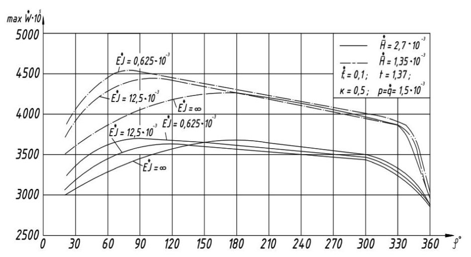 Из анализа графика зависимости величины максимального прогиба от величины сектора загружения временной нагрузкой (рис. 10) видно, что величина максимальных вертикальных прогибов в системе достигает своего наибольшего значения при величине центрального угла, изменяющегося в зависимости от жёсткости опорного контура от 90° (при малых жесткостях) до 180° при недеформируемом опорном контуре.