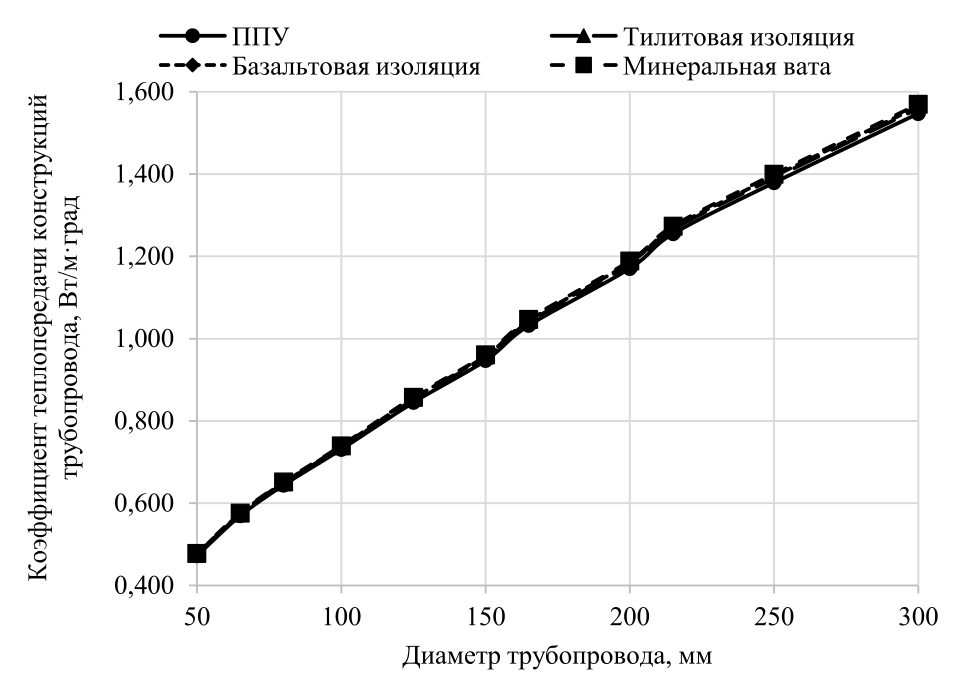 Коэффициент теплопередачи определялся на основе СП 61.13330.2012 «Тепловая изоляция оборудования и трубопроводов», для его нахождения подставлялись следующие коэффициенты теплопроводности: 0,028 Вт/(м°·С) для ППУ изоляции, 0,039 Вт/(м°·С) для тилитовой изоляции, 0,046 Вт/(м°·С) для базальтовой изоляции, 0,058 Вт/(м°·С) для минераловатной изоляции, 58 Вт/(м°·С) для стальных труб, 2,04 Вт/(м°·С) для железобетона, 5,86 Вт/(м°·С) для грунта Волгоградской области при 10 % влажности [8]. Глубина заложения трубопроводов 0,7 м. Толщина изоляции варьировалась в зависимости от диаметра трубопровода на основе имеющегося опытного применения.