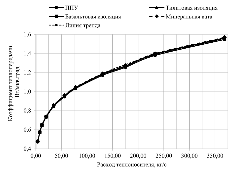 Рис. 2. Коэффициент теплопередачи теплоизоляционных конструкций трубопроводов с различными теплоизоляционными материалами, проложенными в непроходных каналах в зависимости от расхода теплоносителя