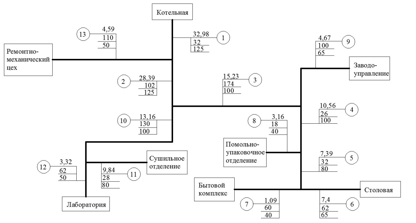 В работе были рассчитаны тепловые потери для сети, представленной на рис. 4, используя метод нормированных удельных потерь (1), теплотехнический расчет (4) и метод распределенного теплового потока (9).