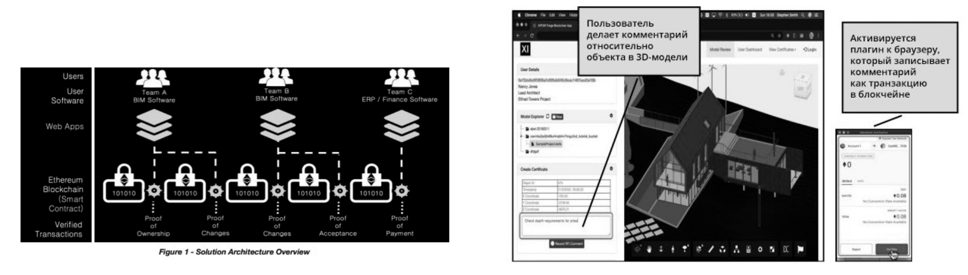 A consortium on blockchain in construction has been created in the world. The consortium members managed to integrate the Autodesk Forge platform and the Ethereum blockchain: the actions that the engineers performed in the Autodesk cloud were successfully recorded as transactions on the blockchain. Thus, the blockchain can become a reliable and the only reliable source about all the changes in the construction project that are made by different people and different programs, the researchers conclude, adding that the same integration can be done for AutoCAD and Revit. The general scheme of the blockchain operation: the actions of different teams that can work with different applications are recorded in a smart contract. Integration of the 3D model and the blockchain: the engineer writes a “check depth” comment for the pile, a window opens on the right, where the comment is recorded as a transaction in the blockchain: it is assigned a time and an identifier (fig. 8).