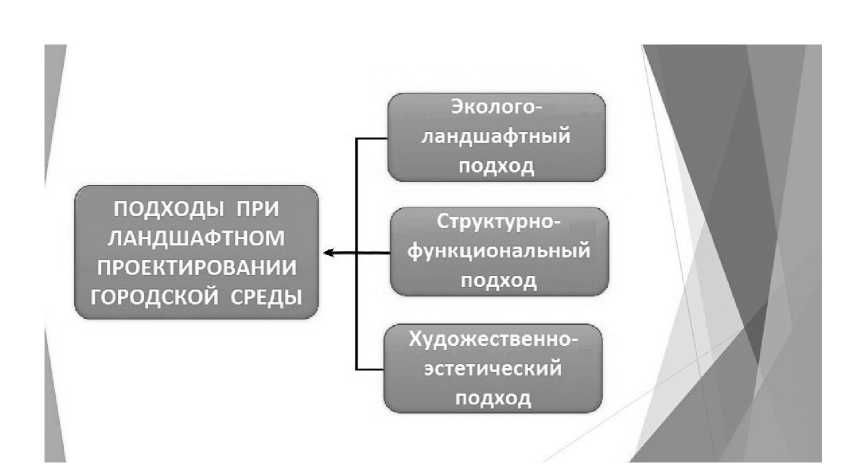 В современных условиях инновационного развития ландшафтного урбанизма «ведется активный поиск новых художественных средств, формируется новая эстетика ландшафтного урбанизма и дизайна» [12, с. 24]. В этом отношении важную роль играет взаимосвязанная целостная система озеленения жилых и общественных пространств, являющихся визуальными акцентами в городской среде. Наряду с этим необходимо отметить комплексный подход при ландшафтном проектировании городской среды, включающий различные приемы (рис. 5).