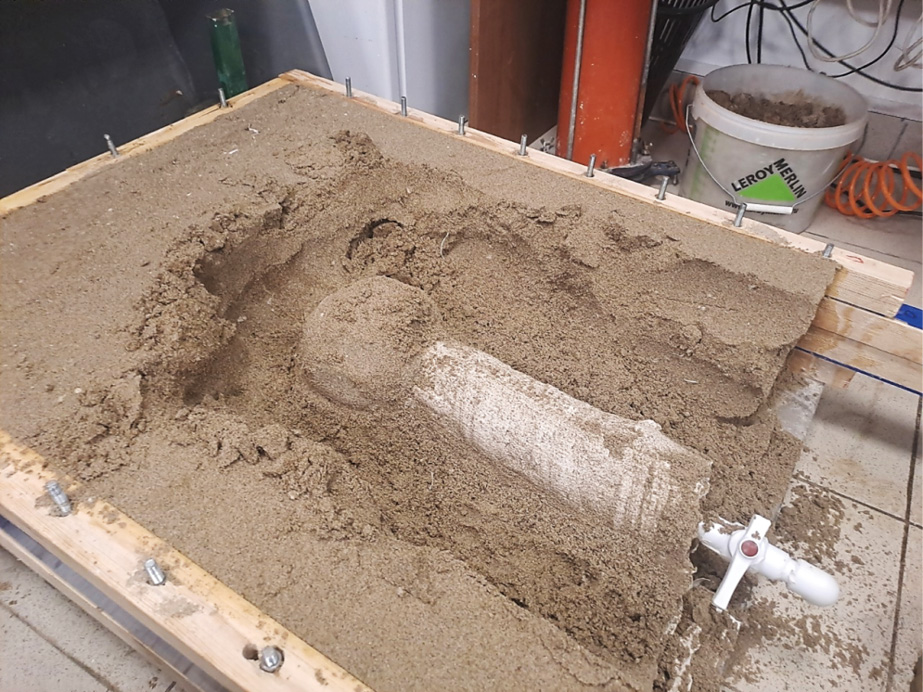 Вследствие высокой фильтрационной способности песка подача смолы осуществлялась в режиме пропитки в диапазоне давлений, не превышающих 1 атм. Количество закаченного материала смолы в ходе проведённых экспериментов составило от 300 до 600 г. Как показали проведенные эксперименты, период набора первичной прочности грунтополимера составляет 1 час, по истечении данного времени свая извлекалась из лотка для исследования (рис. 2).