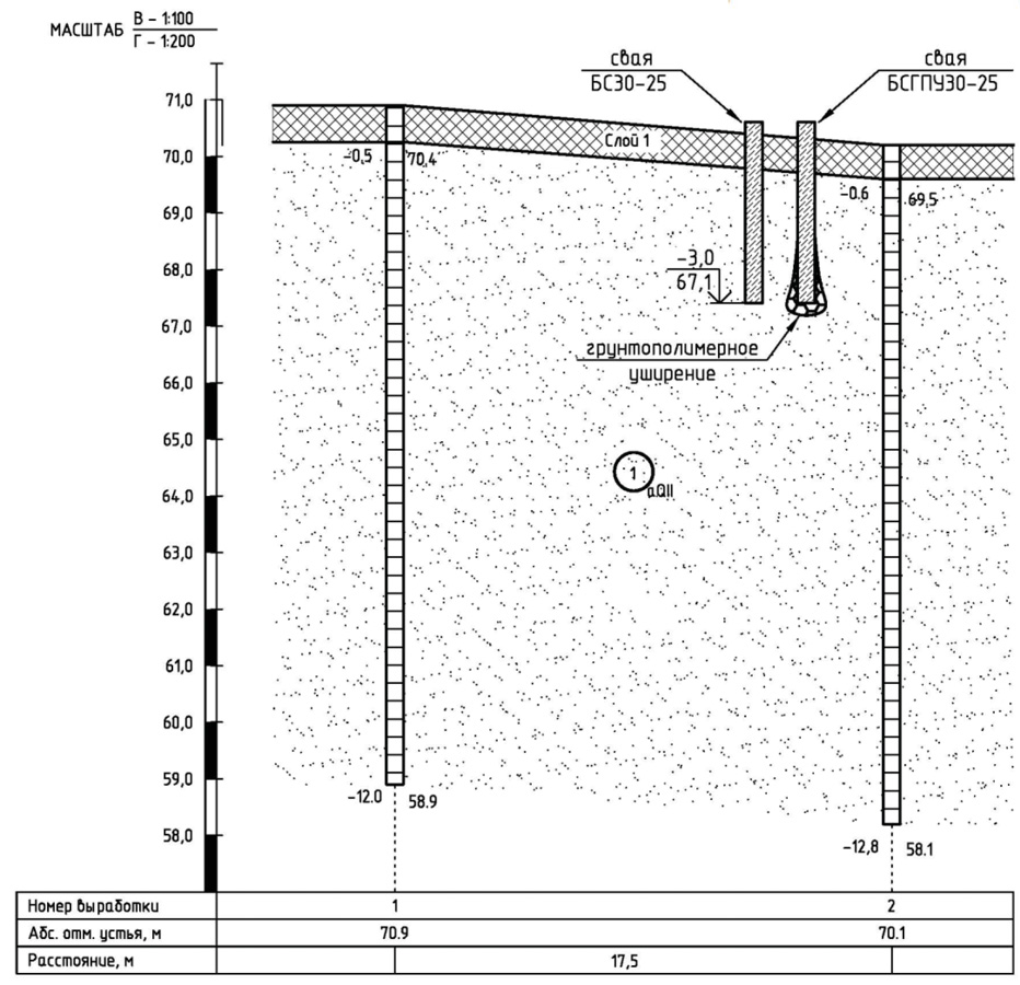 - буровая свая БСГПУ30-25 с диаметром ствола 250 мм, длиной 3,0 м и имеющая грунтополимерное уширение.