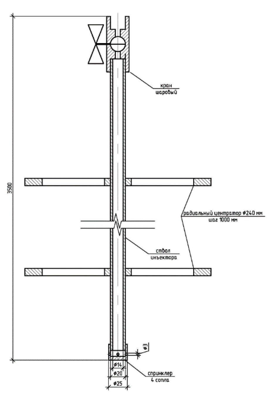 Устройство скважин выполнялось малогабаритной буровой установкой СБГ-ПМ-03. Скважины заполнялись мелкозернистой бетонной смесью с классом бетона по прочности на сжатие В 20. Заполнение скважин производилось при помощи бетонолитной трубы. В скважину для изготовления сваи БСГПУ 30-25 предварительно был установлен инъектор из полипропиленовой трубы с радиальными центраторами. У инъектора имелся запорный шарнирный кран, установленный на верхнем конце. Общий вид и конструкция инъектора показаны на рис. 7 и 8.