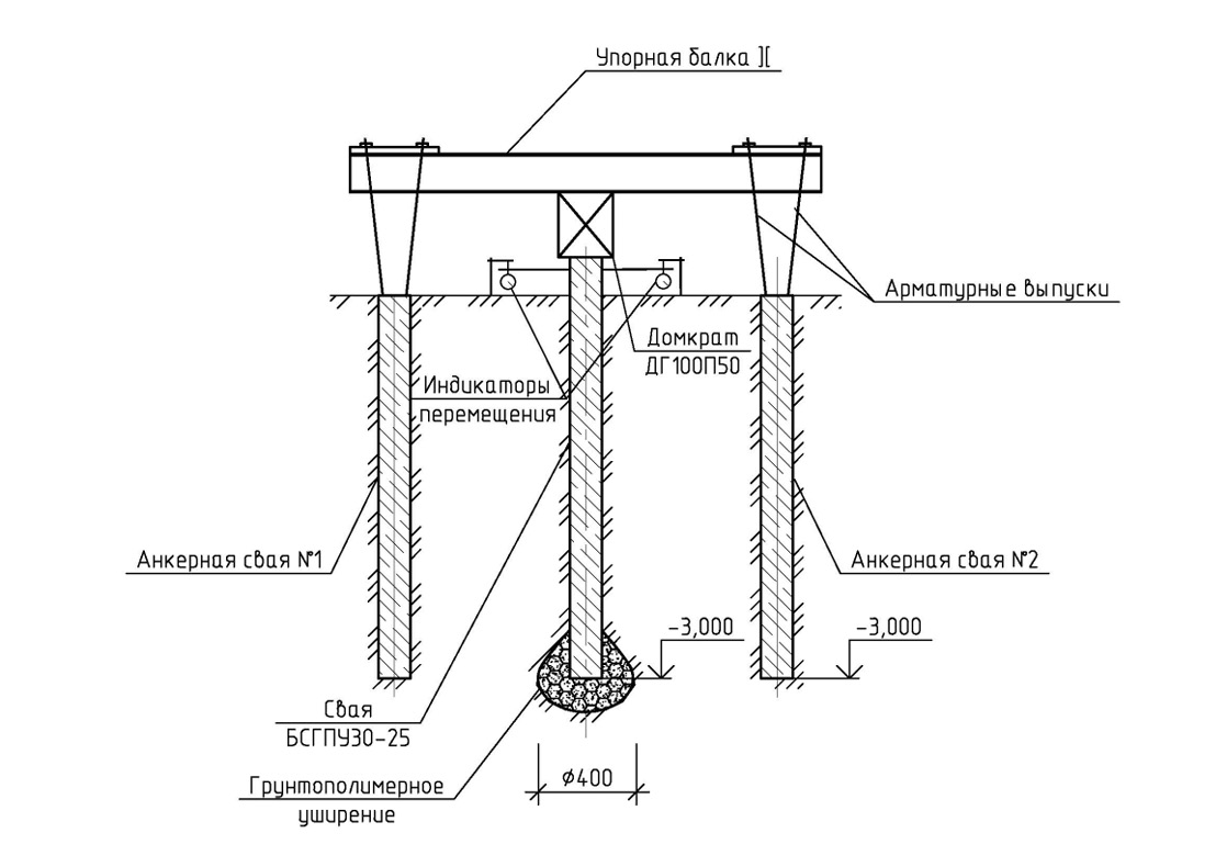Осадка свай фиксировалась двумя индикаторами часового типа с точностью деления 0,01 мм (модификация ИЧ 50). После достижения сваями вертикального перемещения 40 мм проводилась разгрузка опытных свай ступенями, равными удвоенным значениям ступеней нагружения.