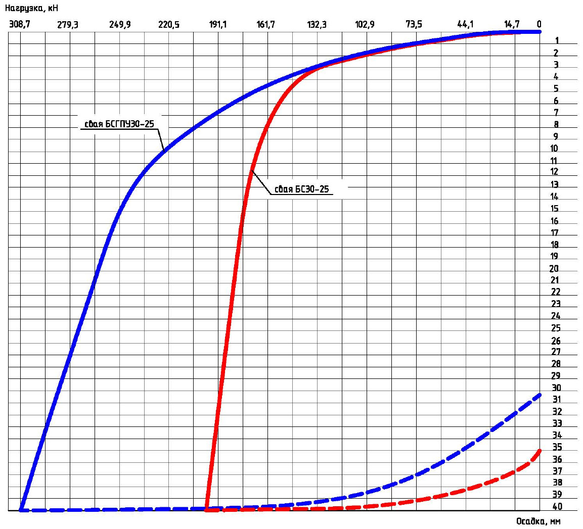 2) Осадка 40 мм достигнута сваей БСГПУ 30-25 при нагрузке 308,7 кН.