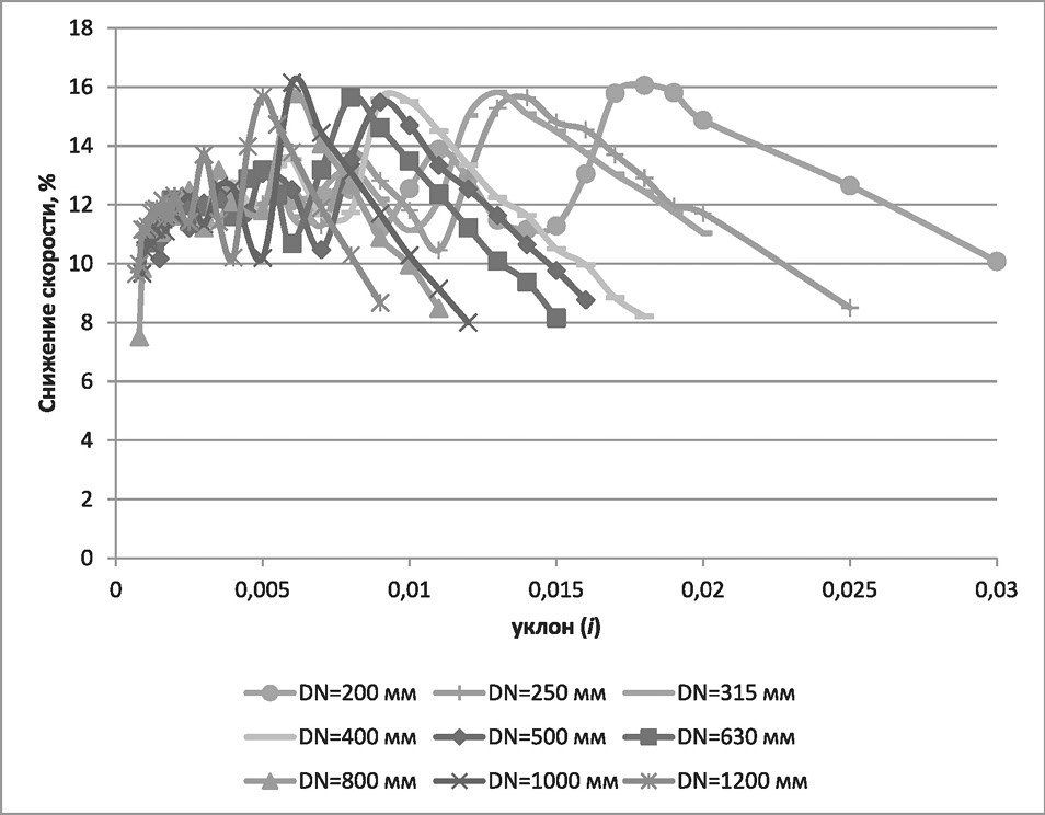 Как видно из рис. 1 и 2, скорость движения воды при изменении уклона имеет скачкообразный вид (чего явно быть не должно) при плавном изменении скорости. При снижении расхода на треть скорость снижается максимум на 16 %, т. е. примерно на одну шестую, что обусловлено спецификой безнапорного течения воды в трубах ‒ уменьшается наполнение и площадь живого сечения. Скачкообразное изменение скорости обусловлено, вероятнее всего, неточностью при определении значений по таблицам линейной интерполяцией.
