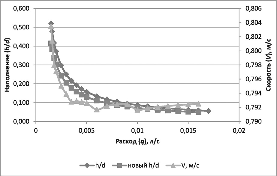 Значения наполнения, скорости и расхода, полученные для трубы DN = 500 мм по расчетным зависимостям с переменными, участвующими в гидравлическом расчете как при составлении таблиц Рекомендаций, приведены в табл. 3 и на рис. 3.