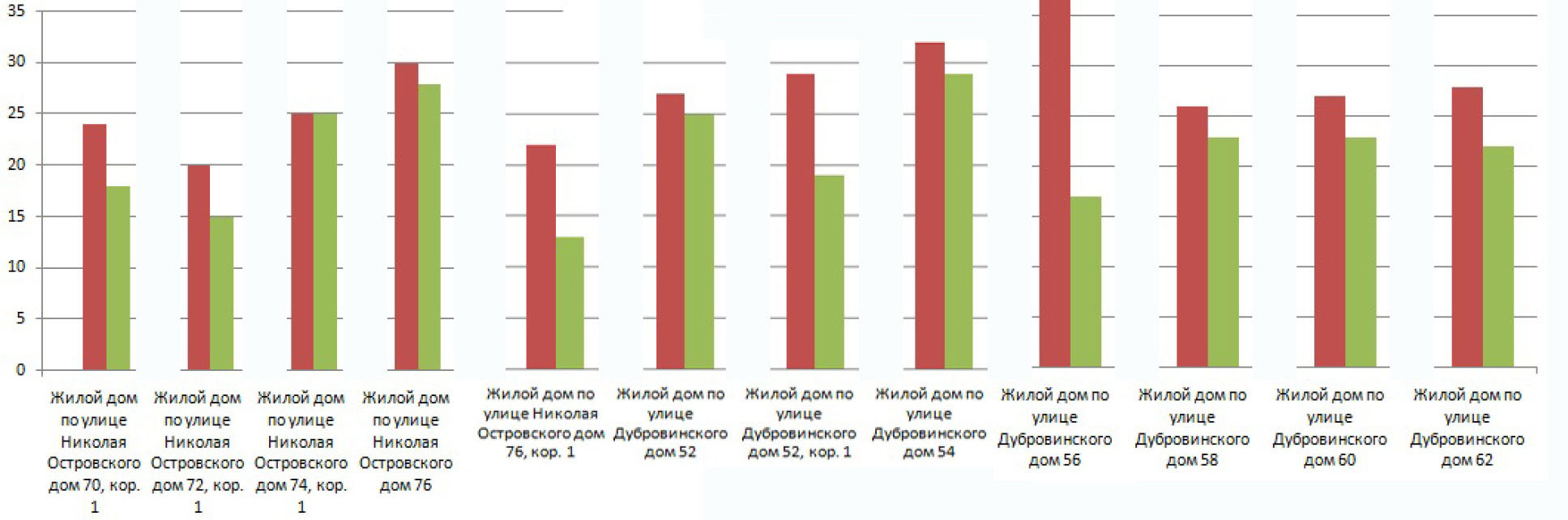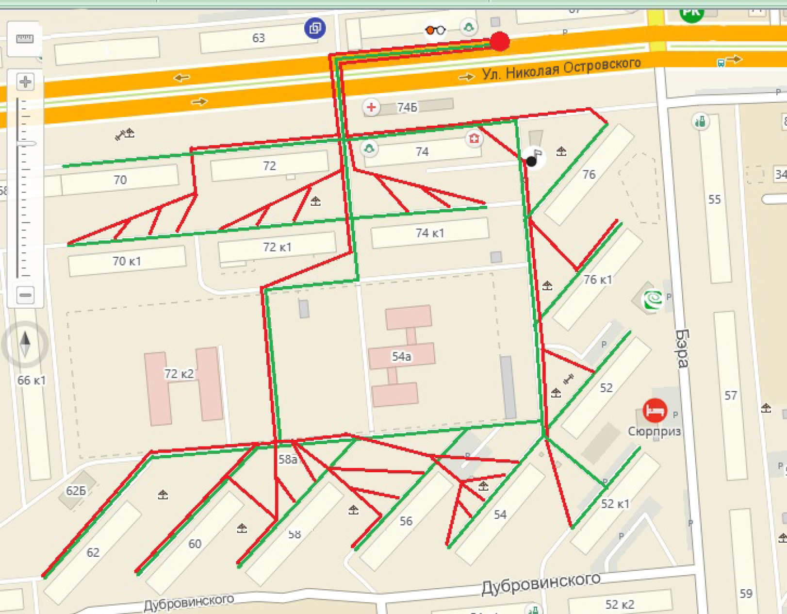 Рис. 3. Схема с размещением домов на ул. Н. Островского и с обозначениями двух направлений: зеленого и красного
