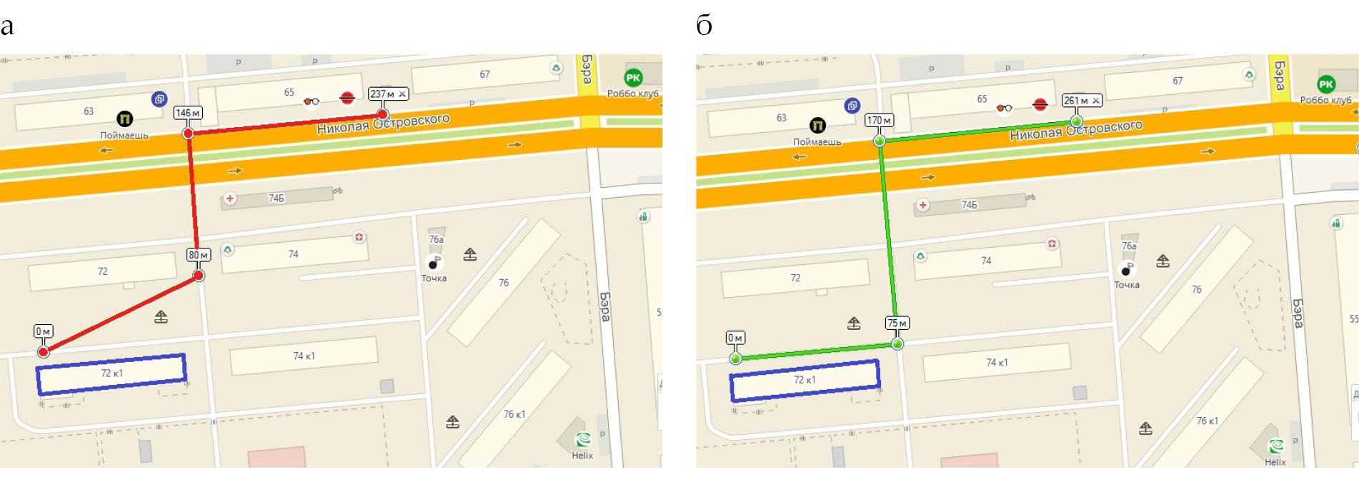 По карте 2 ГИС были измерены пешеходные пути, которые обозначены красным цветом, ‒ это расстояние от подъездов жилых домов до остановки общественного транспорта(на примере жилого дома по ул. Николая Островского, д. 72, корп. 1) (рис. 5, а). Затем были измерены пешеходные пути, обозначенные на карте зеленым цветом (рис. 5, б).