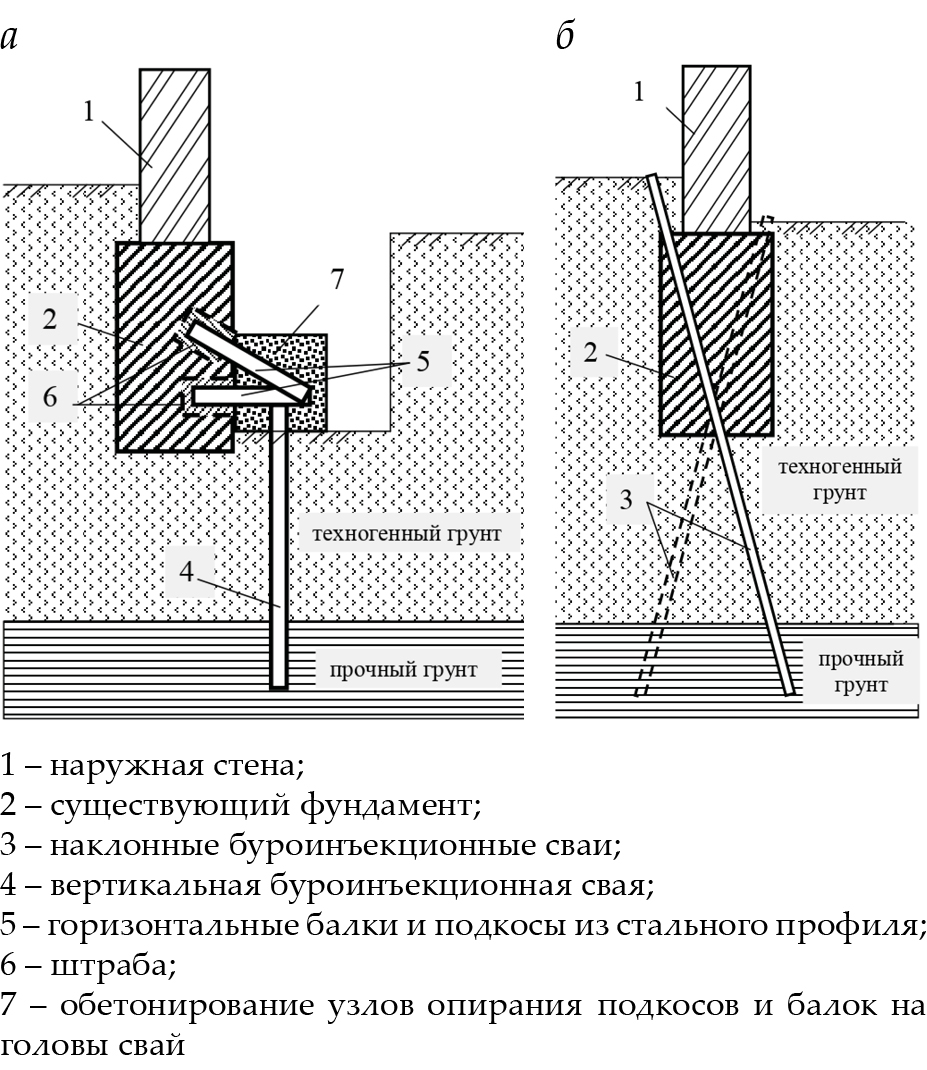 Рис. 14. Схемы усиления фундаментов существующих зданий буроинъекционными сваями: а – вертикальными; б – наклонными