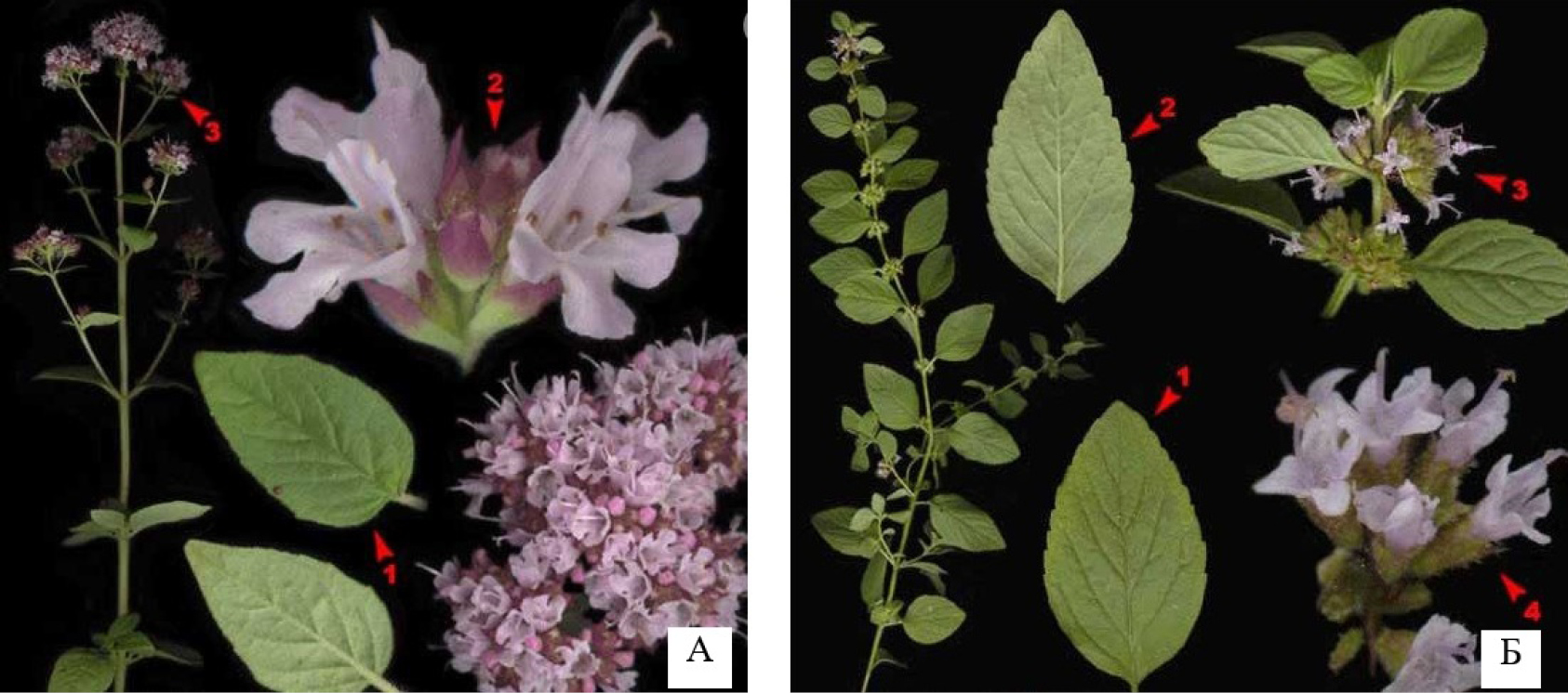 Рис. 1. Внешний вид растений: А ‒ душица обыкновенная; Б ‒ мята полевая
