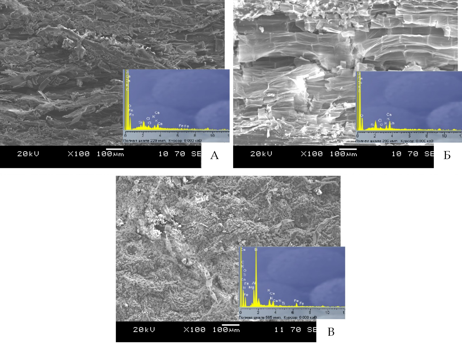 Рис. 2. Микрофотографии душицы обыкновенной и данные микрорентгеноспектрального анализа: А – корень; Б – стебель; В – лист