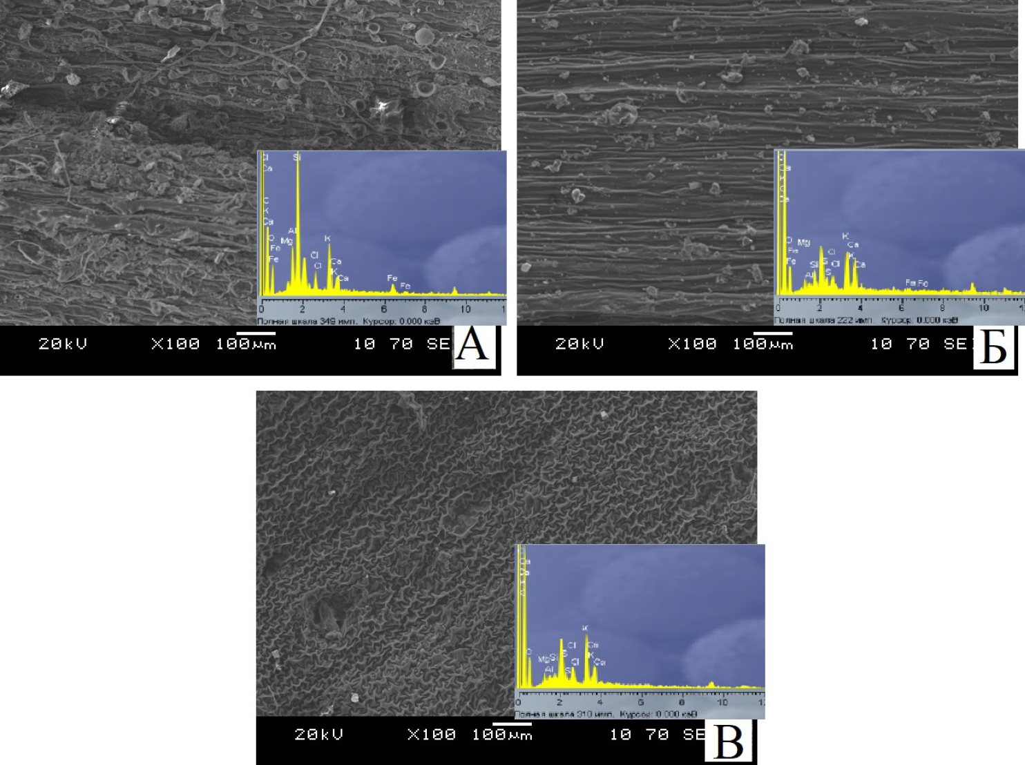 Fig. 2. Micrographs of common oregano and microrentgenospectral analysis data: A ‒ root; B ‒ stem; B ‒ sheet