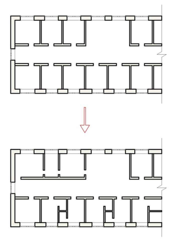 Здесь применен принцип реконструкции как изменение внутренней организации лечебного пространства, но без изменения габаритных размеров и объемов корпуса в целом. Часто это связано с уменьшением или увеличением размеров отдельных помещений путем перестановки перегородок, созданием специализированных палат (кабинетов) с современным оборудованием и системами жизнеобеспечения, с учетом новых норм размещения и медицинского обслуживания пациентов. В этом случае также приходится выводить из эксплуатации определенную часть помещений, однако перерыв в использовании помещений может занимать относительно небольшое время: ориентировочно шесть-восемь месяцев. Условная схема переоборудования внутренней организации пространства приведена на рис. 9. Эти работы также могут проводиться как капитальный ремонт с учетом перепланировки помещений.