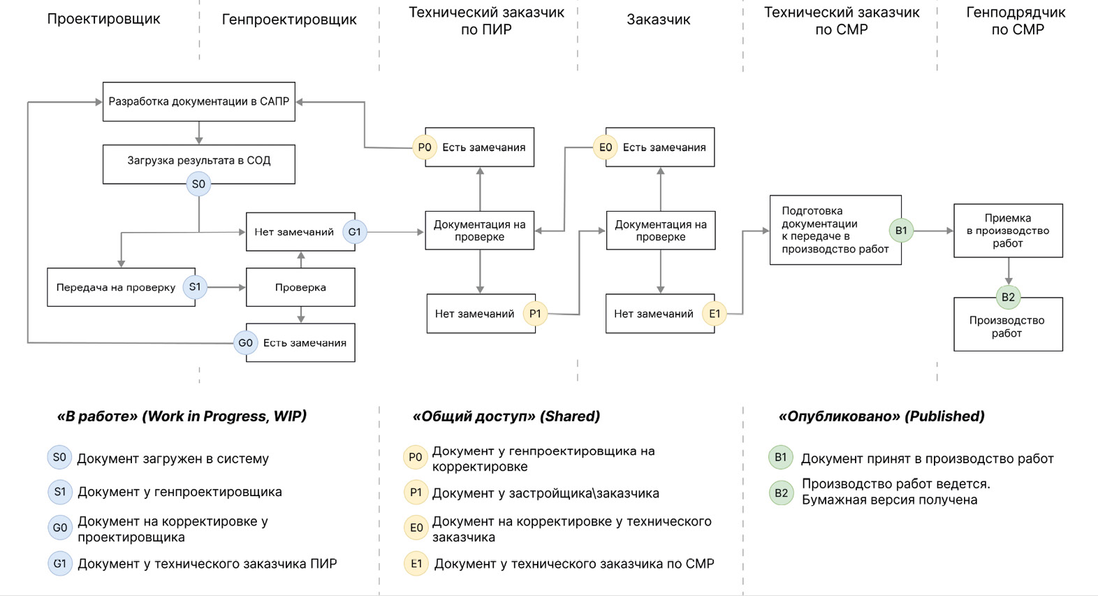 Согласно приведенной схеме, каждый участник проекта строительства работает с одним или ограниченным количеством статусов документа на входе и после проведенной работы устанавливает новый статус на выходе. При этом документ может продвигаться вперед по линии жизненного цикла, а может вернуться назад, если к нему появились замечания. Благодаря статусам задаётся понимание о состоянии информации, размещённой в документах, на их жизненном цикле, а также кто с этой информацией должен работать.