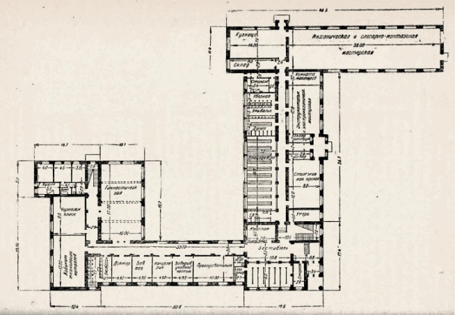 Fig. 9. The FZU building in the socialist city of Uralmash. Architect P.V. Oransky, 1929. Plan of the 1st floor [7]