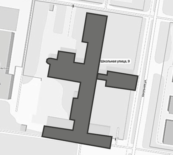 Иногда здания представляли собой комбинированные варианты объединения блоков с чередованием открытых и полуоткрытых двориков, которые определялись значительными параметрами территории, сравнительно большой вместимостью школ, объединением их с другими учебными заведениями, многофункциональностью. Например, здание школы ФЗУ в соцгороде Уралмаша, построенное по проекту П.В. Оранского в 1931 г., было задумано как крупномасштабный разветвленный объект. С одной стороны, проект предусматривал четкое функциональное зонирование: учебный корпус размещался на севере (слева на плане); производственный – на юге (справа на плане), где располагались ударный, товарный и термический цеха со вспомогательными помещениями; по центру их объединял блок административных помещений [4]. С другой стороны, он представлял собой смешение двух типов пространственно-планировочных решений: энергично выступающий центральный ризалит с входной группой и залом на главном фасаде северного корпуса не формировал «лакун» – внутренних пространств; тогда как на юге два блока-выступа цехов формировали неглубокий курдонер между ними; в середине комплекса также было образовано два глубоких полуоткрытых двора, окруженных с трех сторон корпусами разного функционального назначения (рис. 9).