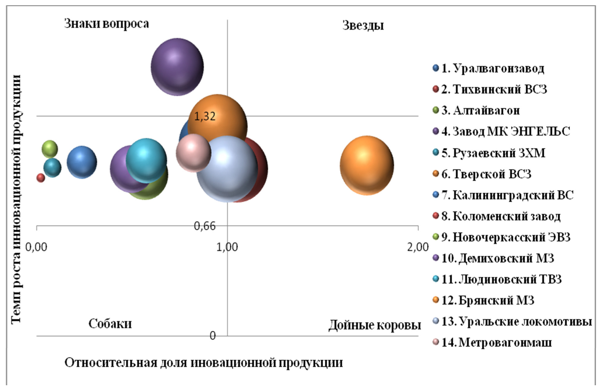 ПОТМ обладают высоким инновационным потенциалом как на внутреннем, так и на внешнем рынках. Анализ эффективности деятельности предприятий с использованием методологии портфельного анализа свидетельствует о потребности в развитии их стратегии, т. к. большинство из них характеризуется слабой, неустойчивой позицией на рынке (рис. 4).