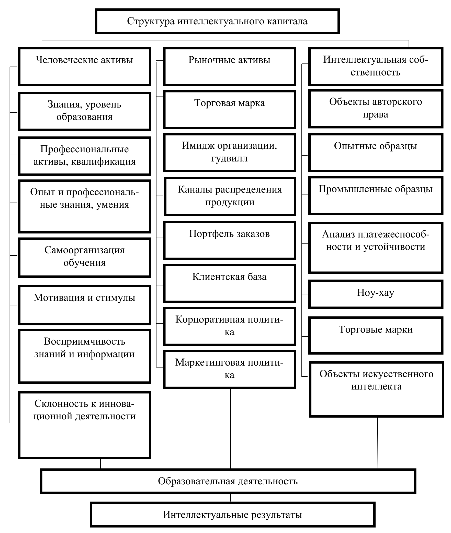 Интеллектуальный капитал представляет основной фактор в трансформации субъектов инновационной деятельности, в том числе организаций высшего образования. Значимость интеллектуального капитала в осуществлении инновационной деятельности определяется его научным и практическим характером. На его основе осуществляются: изменение бизнес-среды развития организации, переформатирование инновационных процессов, кратное повышение эффективности деятельности субъектов экономики, учет факторов влияния, производство продукции, аналогов которой еще не представлено на рынке [1]. Основное значение интеллектуального капитала в сфере образования выражено повышением качества образования, переходом к непрерывному образованию, созданием творческой личности и обеспечении ее профессиональной мобильности.